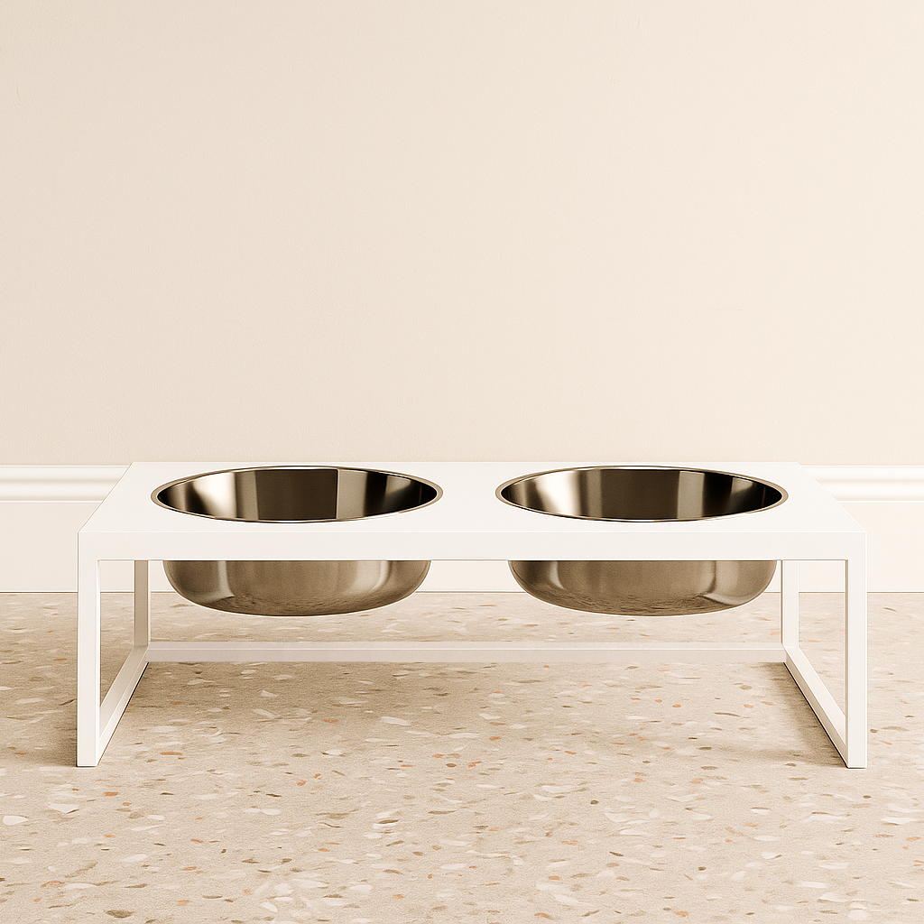 The Brooklyn Pet Bowl features steel bowls within a sleek, powder-coated metal rectangular frame that raises them to an ideal height, reducing strain on your pet's neck. Combining durability with style, it’s the comfortable feeding solution for your beloved pet.